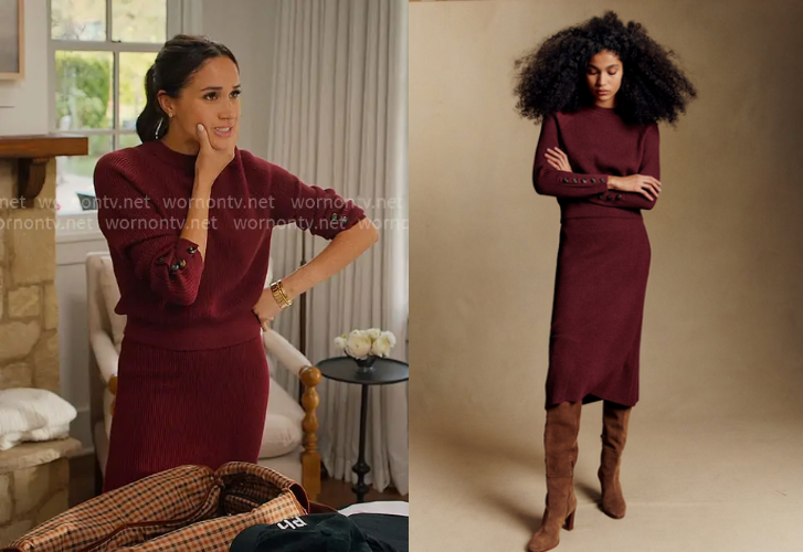 Sami Jumper in Burgundy by Sezane-$145 and Naelle Skirt in Burgundy by Sezane-$175