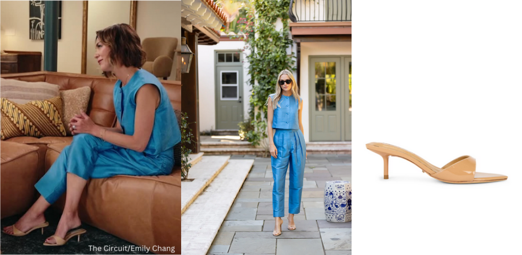Julia Amory ‘Blair’ top in cornflower blue-$218 and Julia Amory ‘Deco’ Pant in cornflower blue-$147 and Tony Bianco ‘Fiesta Heel’-$170