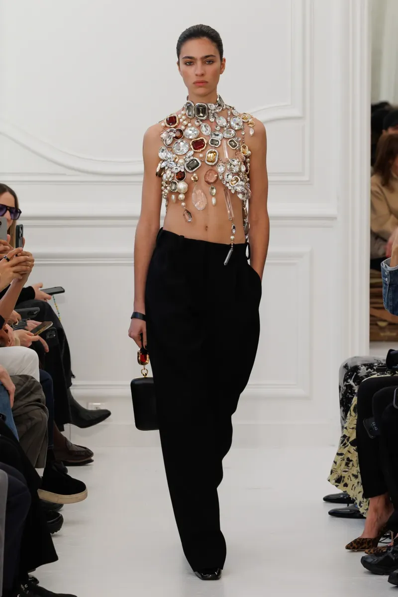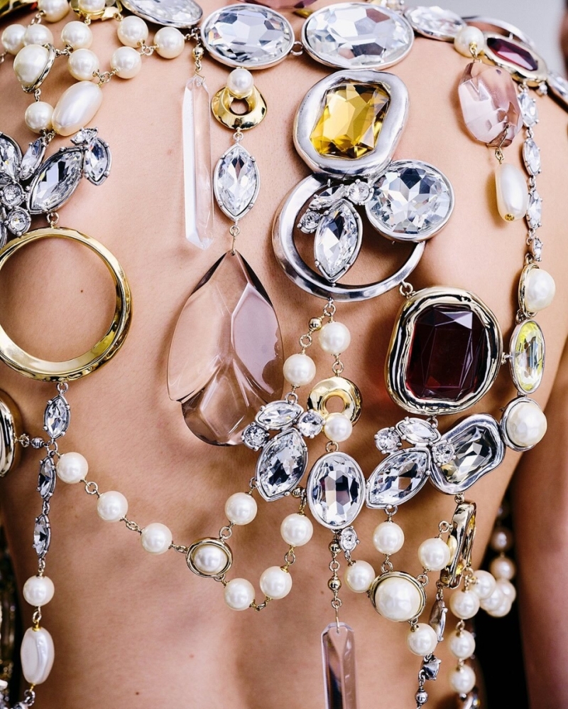 Скульптурный лиф, инкрустированный драгоценными камнями, казался кинематографичным в лучшем смысле этого слова — прямой намек на Lisle Von Rhuman в исполнении Изабеллы Росселлини в фильме «Death Becomes Her».