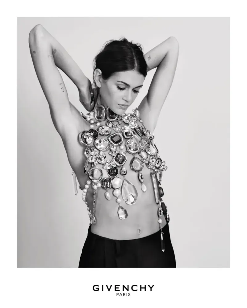 Kaia Gerber снялась в этом асимметричном топе для рекламной кампании Givenchy осенью 2025 года. Черно-белая реклама появилась несколько недель назад, что дало актрисе и ее стилисту достаточно времени, чтобы заполучить этот топ. Гербер и модель с подиума сочетали топ с черными брюками, чтобы не затмить нежный дизайн. Ортега выбрала черную макси-юбку с разрезом до бедра и низкой талией.