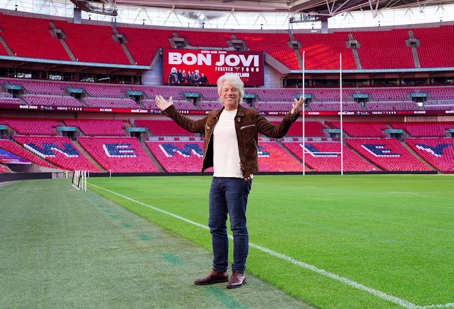 Jon Bon Jovi позирует на поле «Уэмбли» во время объявления о туре Forever Tour на стадионе «Уэмбли» 24 октября в Лондоне.