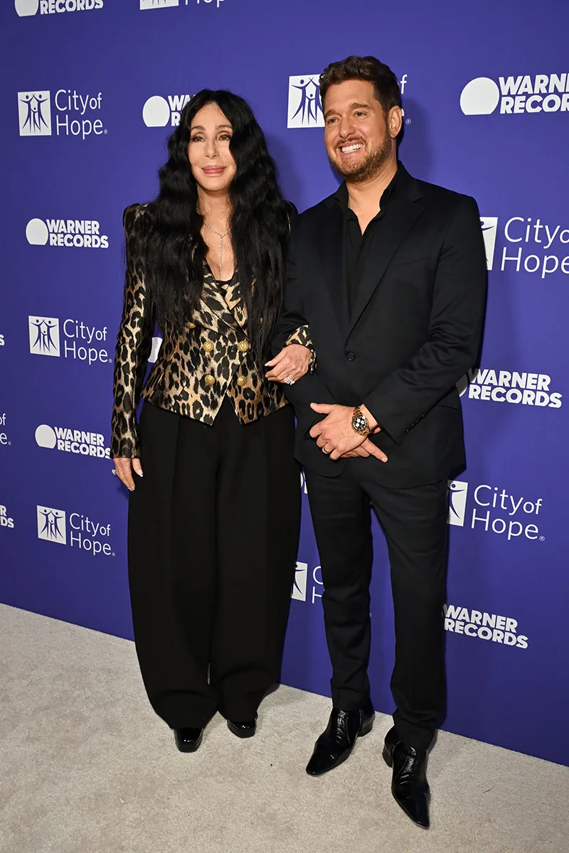 Cher в пиджаке с леопардовым принтом от Balmain на гала-вечере City of Hope Spirit of Life в Западном Голливуде, штат Калифорния 15 октября. К ней присоединился канадский певец Michael Bublé, одетый в двубортный блейзер Balmain.