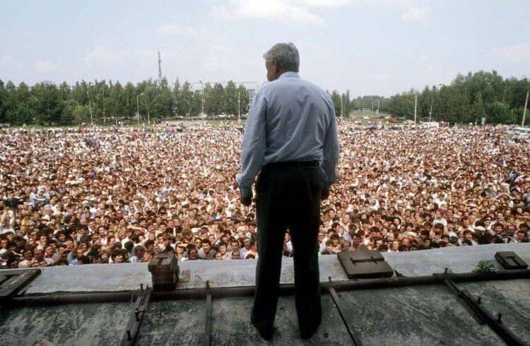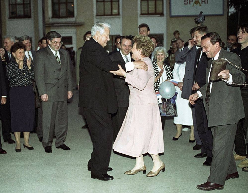 Борис Ельцин с женой Наиной танцуют на митинге-концерте в поддержку президента, Новосибирск, 1996 год