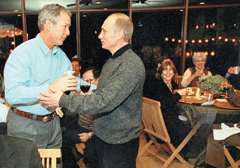 Владимир Путин и Джордж Буш пьют вино на глазах у посетителей американского ресторана, 2000 год