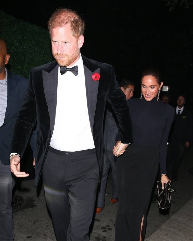 В то время как принц Гарри выбрал классический черный костюм и бабочку, дополнив образ алой брошью в честь Дня памяти павших, Меган вместо привычных ей откровенных нарядов, предстала в довольно скромном черном одеянии с водолазкой и юбкой с разрезом. В сети сразу же обратили внимание на изменившуюся фигуру герцогини, предположив, что за “неброской одеждой” скрывается… третья беременность.