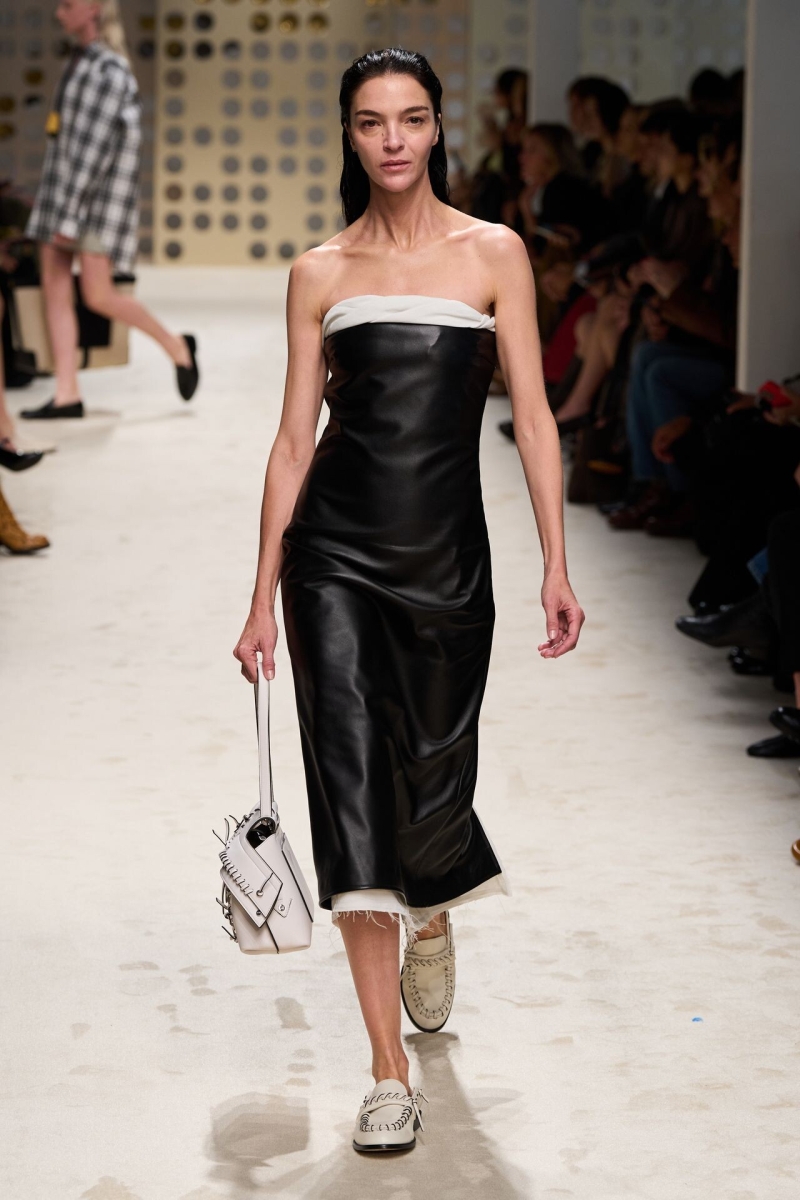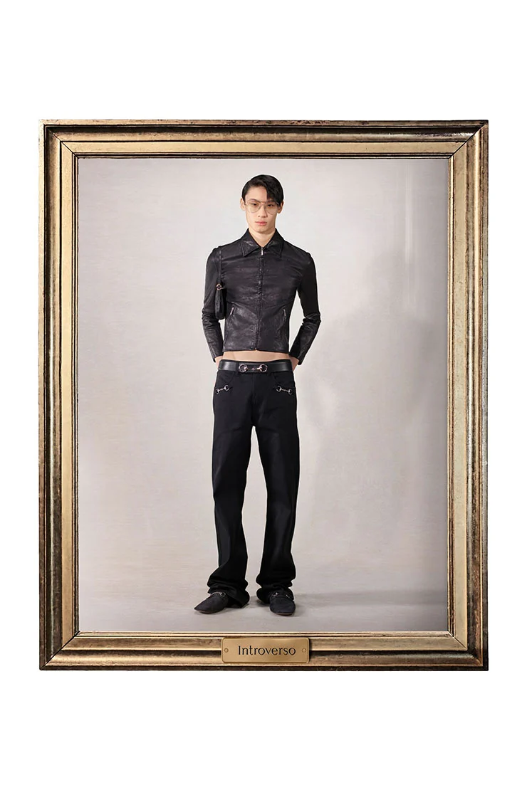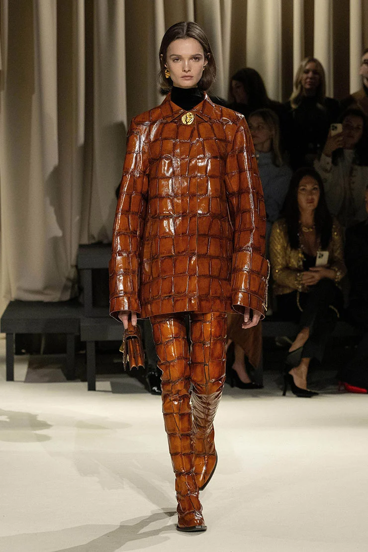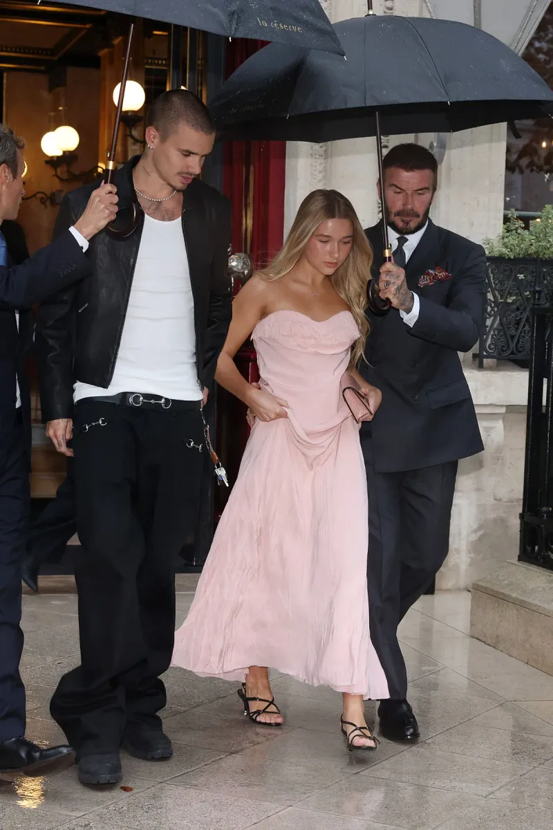 На показ Victoria Beckham’s Spring 2026 дочка Harper надела розовое платье от Victoria Beckham. Но Romeo Beckham был в кожаной куртке приталенного кроя Gucci La Famiglia с тиснением Gucci Crest. Его расклешенные джинсы с металлическими деталями Horsebit могут показаться длинными, но такова эстетика Демны. Коллекция хоть и молодая, но она уже доказывает свою мощь.