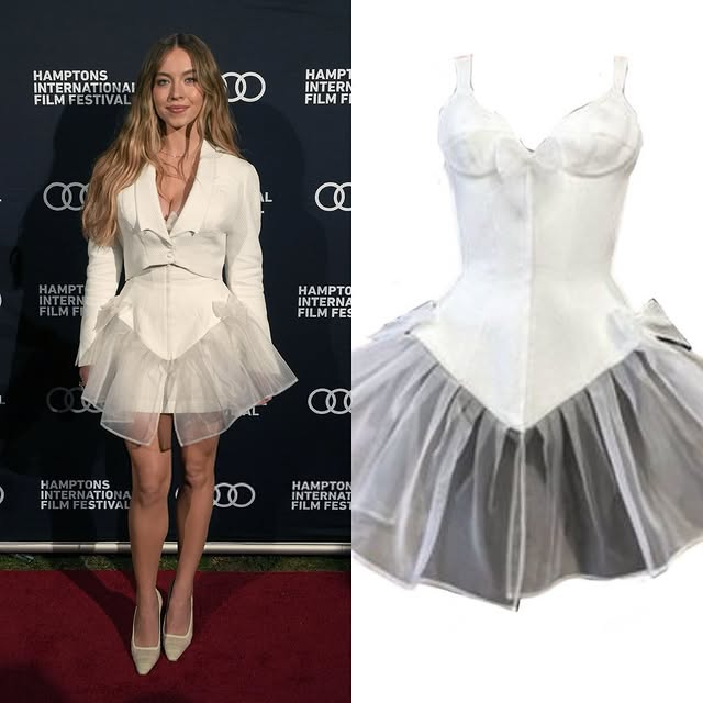 Sydney Sweeney на Hamptons International Film Festival привлекла к себе внимание в винтажном платье-пачке от Thierry Mugler, которое больше подходило для балетной сцены, чем для красной дорожки. Платье эпохи 90-х годов сочеталось с укороченным пиджаком с фигурными лацканами. Она сочетала образ с туфлями на высоком каблуке из тюля цвета слоновой кости от Jimmy Choo.