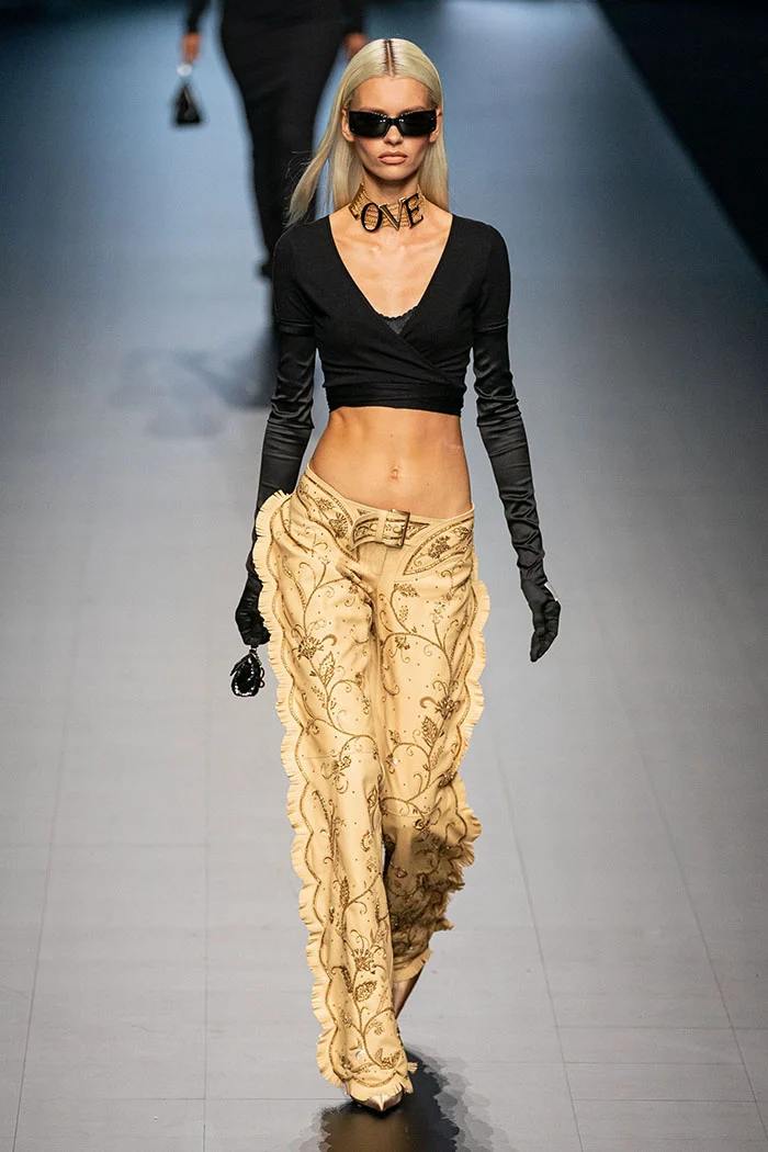 Bella Hadid в Сохо, штат Нью-Йорк, перед своим появлением на показе мод Victoria's Secret Fashion Show, в брюках от Dolce & Gabbana весна 2001 года, вдохновленных вестерном. Модель не новичок в архивах — она практически построила свой современный гардероб вокруг переизданных или винтажных находок — и этот образ без особых усилий продолжает это направление. Эти брюки, лихо переизданные в рамках коллаборации Ким Кардашьян с Dolce & Gabbana 2023 года, отличаются замысловатой вышивкой и характерным ковбойским стилем. Но Белла сочетала брюки с минималистичной коричневой водолазкой без рукавов и остроконечными коричневыми сапогами, найдя золотую середину между гламуром начала 2000-х и западной беззаботностью.