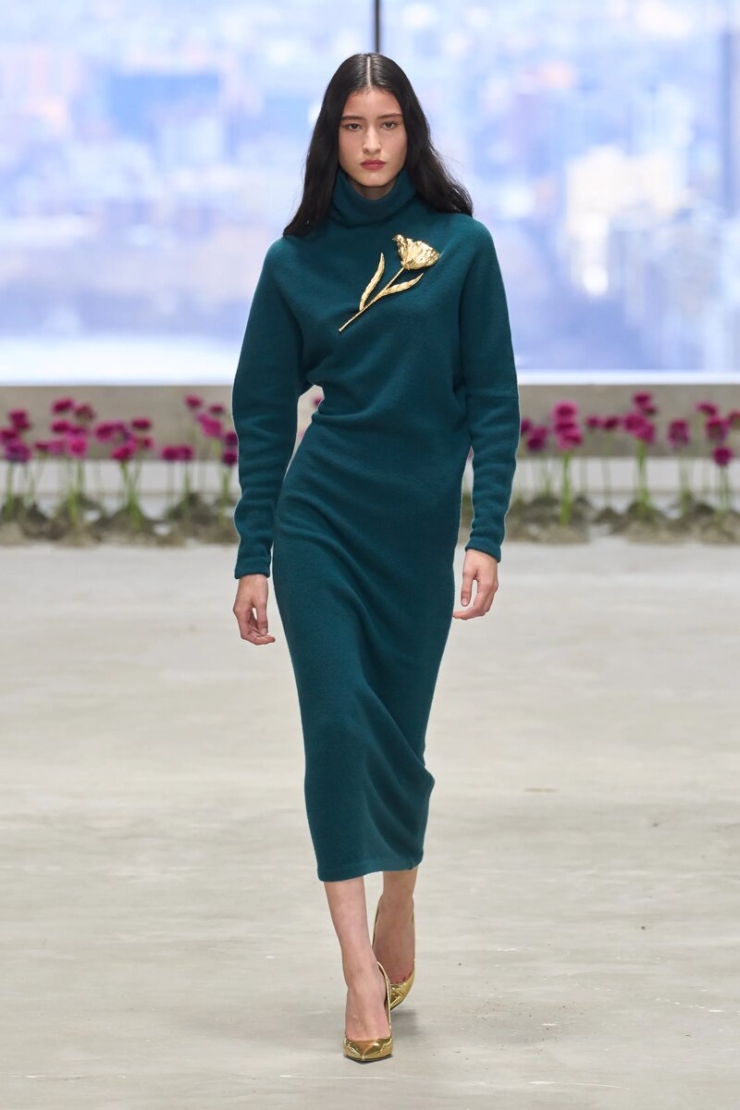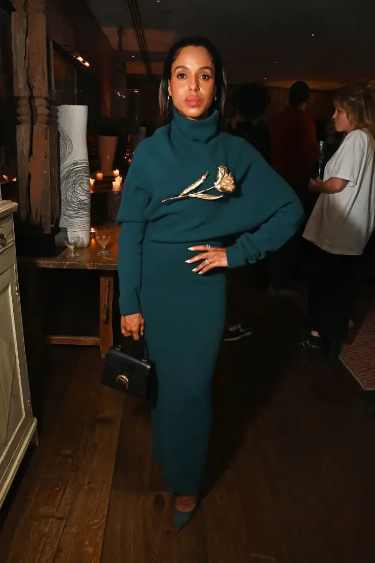 Kerry Washington на показе фильма ‘Wake Up Dead Man: A Knives Out Mystery’ в Лондоне в асимметричном платье-водолазке сосново-зеленого цвета от Carolina Herrera из коллекции осени 2025 года, дополненное фирменной золотой брошью в виде тюльпана. Сезон свитеров официально наступил, и Керри приводит веские аргументы в его пользу, особенно когда речь идет о таком насыщенном лесном оттенке. Кому-то может показаться, что брошь оверсайз чересчур, но она добавила скульптурный, слегка гламурный контраст к текстуре трикотажа. Подходящие сосново-зеленые замшевые туфли-лодочки и сумка Delvaux Brillant идеально соединили все воедино — шикарно и сезонно.