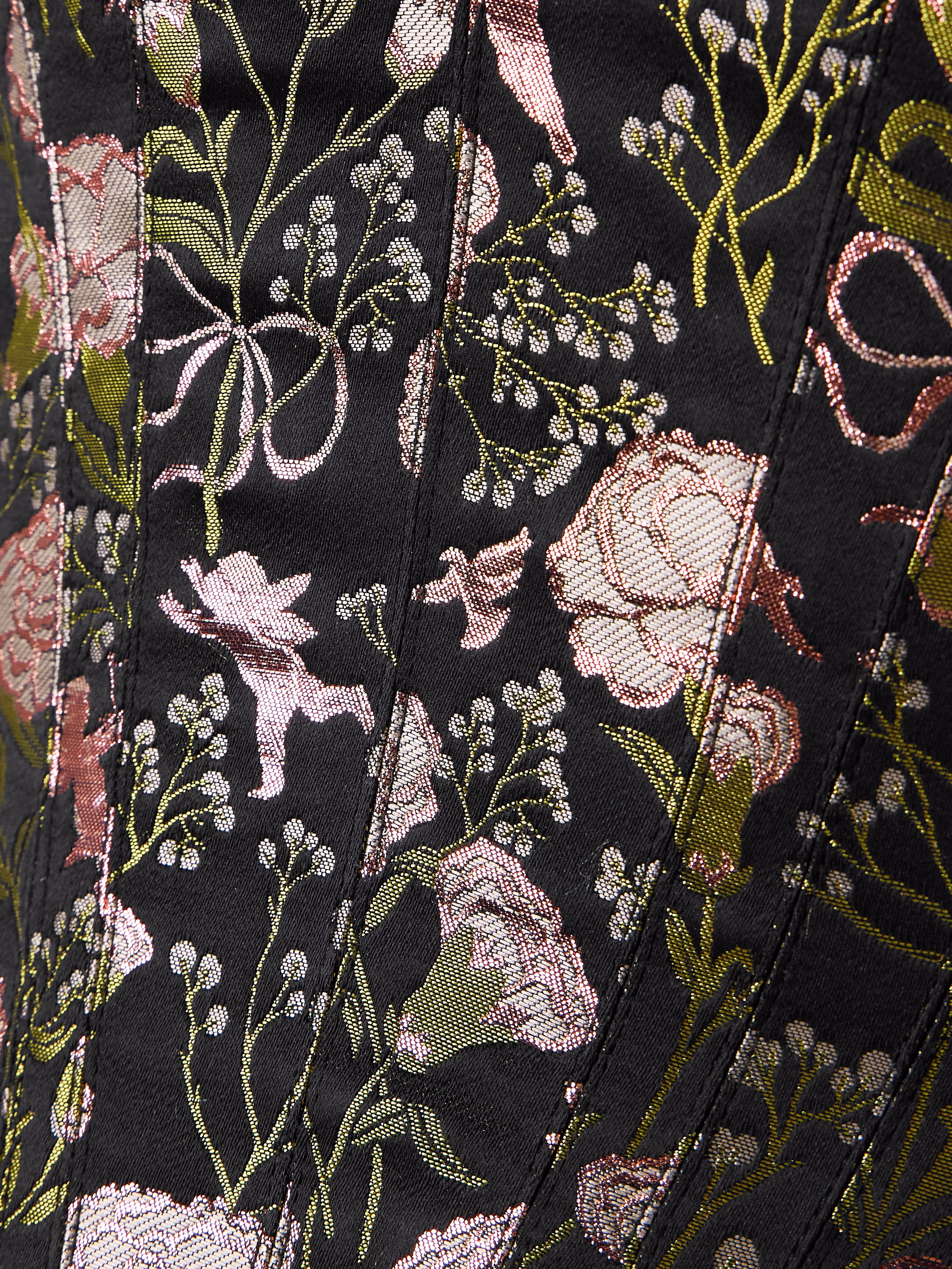 Топ-бюстье из парчи без бретелек Julie $4,500. Парчовая мини юбка $750.