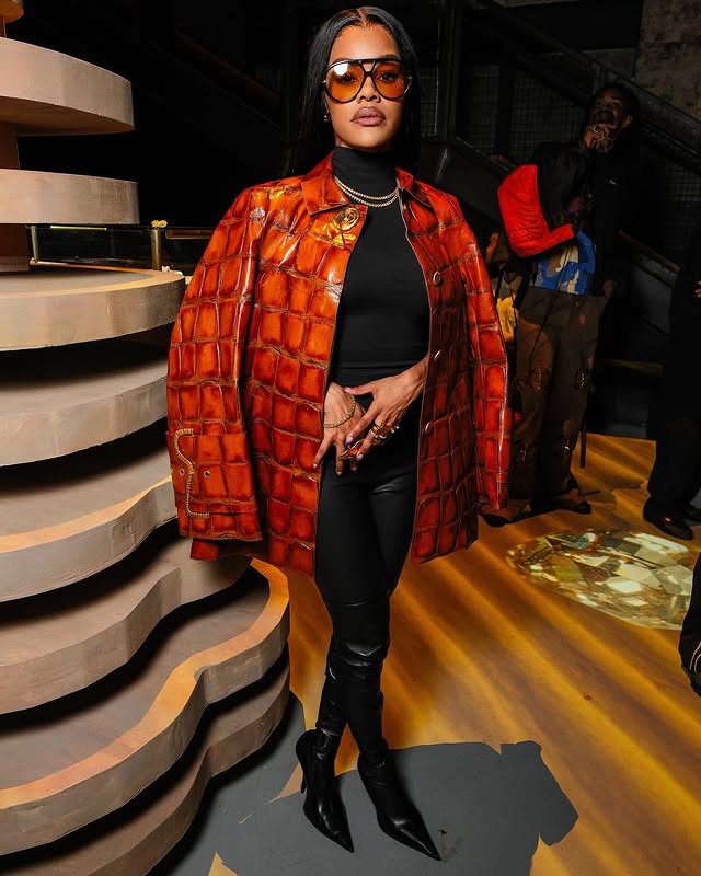 Teyana Taylor невозможно было не заметить в пальто Schiaparelli Fall 2024. Пальто изготовлено не из натуральной кожи животных — это дизайн trompe-l'œil имитация текстуры крокодила или аллигатора, но на самом деле сделанный из тисненой кожи. Вместо сочетающихся подиумных ботинок она стилизовала одежду с черными сапогами до бедра и черной водолазкой, позволив пальто оставаться главным украшением. Если бы это был концерт или другая музыкальная красная ковровая дорожка, подиумные ботинки подошли бы, но всему свое время и место. Teyana завершила свой образ ожерельем и браслетом Desert Diamonds Grandview Klein с натуральными бриллиантами из Намибии, хотя все взгляды были прикованы к образу Schiaparelli.