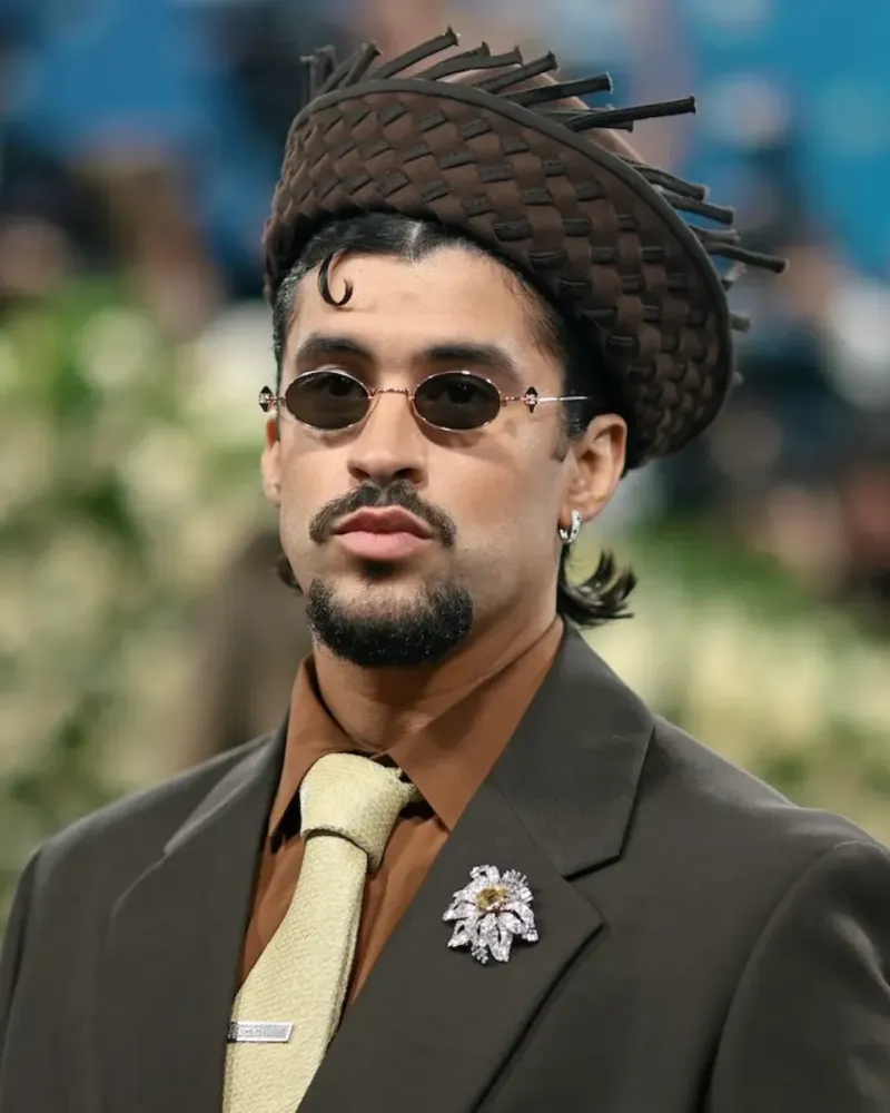 Bad Bunny в костюме Prada с брошью Cartier Diamond Jewelry с натуральными бриллиантами и цветочным узором Cartier с желтым бриллиантом в качестве пестика.