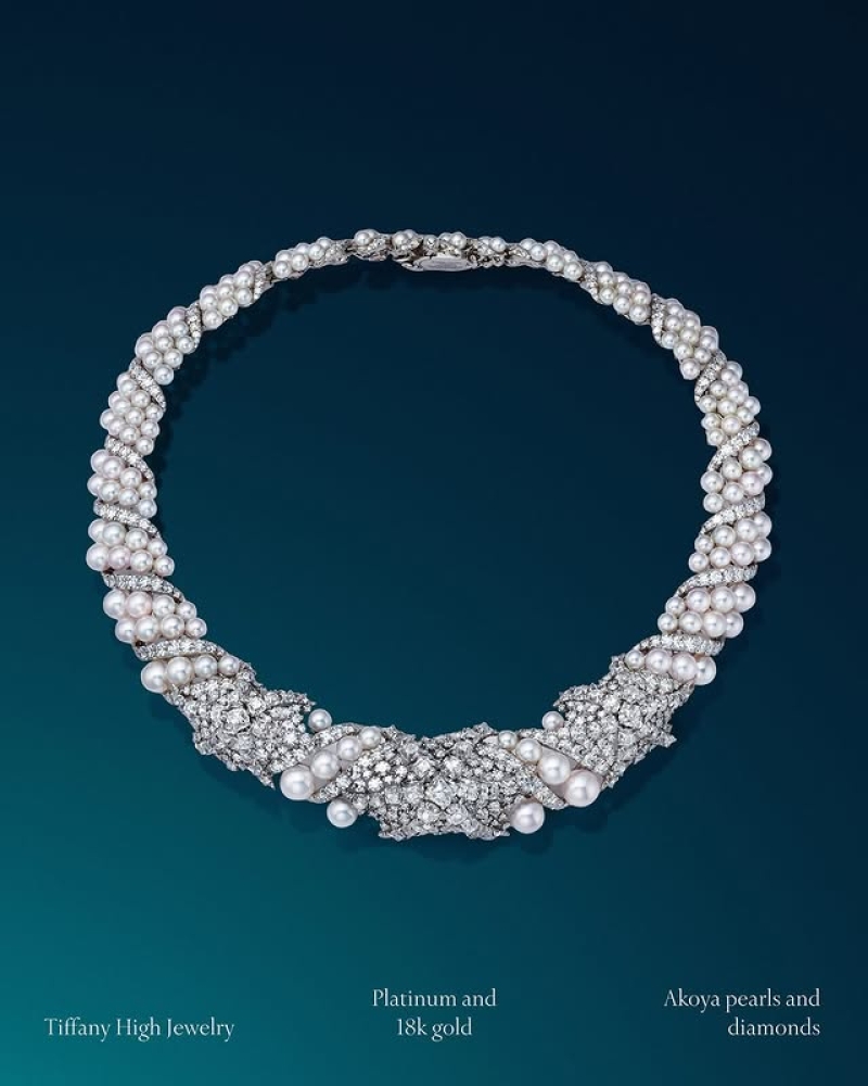 Miranda Kerr в платье от Dior и в колье Tiffany High Jewelry из платины и 18-каратного золота с жемчугом Akoya и бриллиантами общим весом более 50 карат.