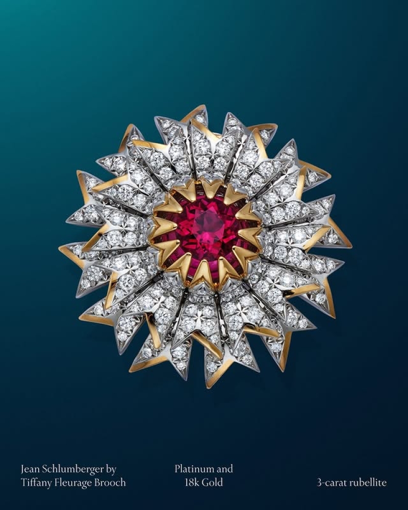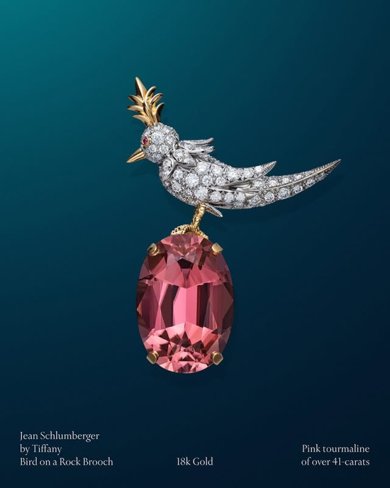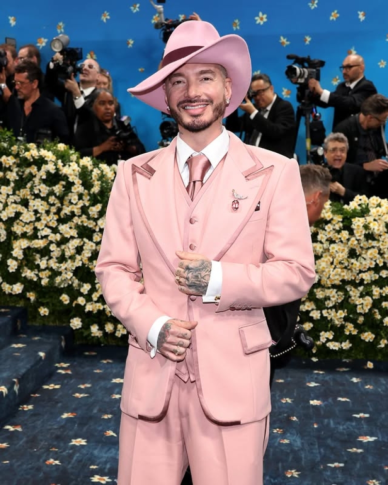 J Balvin в костюме от Marc Jacobs с брошью Jean Schlumberger от Tiffany Bird on a Rock с розовым турмалином весом более 41 карата.