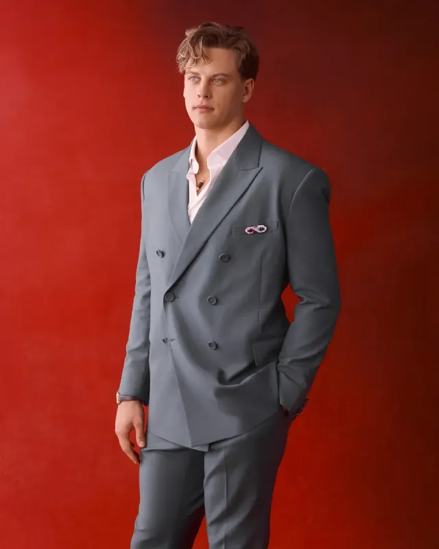 Joe Burrow в костюме Gucci с платиновой булавкой Cartier High Jewelry в стиле ар-деко с крупными розовыми и синими сапфирами, окруженными бриллиантами. «Я никогда раньше не носил брошь, но эта просто привлекла мое внимание своими цветами и формами», — сказал он.