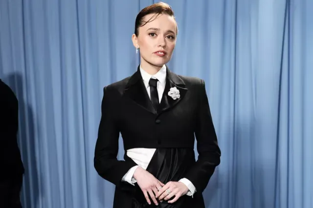 Aimee Lou Wood в наряде, разработанный лондонским дизайнером Priya Ahluwalia и украсила жакет элегантной брошью Cartier Collection из белого золота с бриллиантами, выпущенной примерно в 1939 году в Париже.