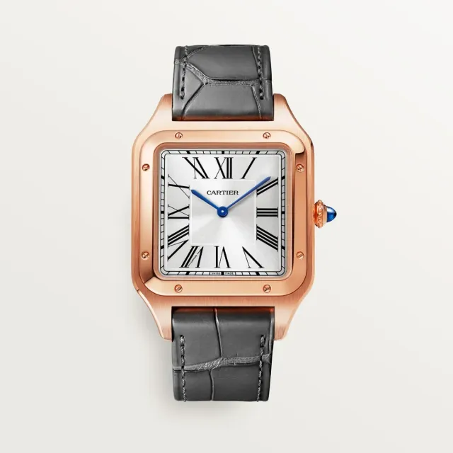 Примечательные часы Santos-Dumont, модель увеличенного размера, мануфактурный механический механизм с ручным заводом, калибр 430 MC. Корпус из розового золота 750/1000, заводная головка из бисера с сапфировым кабошоном, посеребренный сатинированный циферблат с эффектом солнечных лучей, римские цифры, стрелки в форме меча из вороненой стали, сапфировое стекло. Серый ремешок из кожи аллигатора и застежка из розового золота 750/1000 пробы.