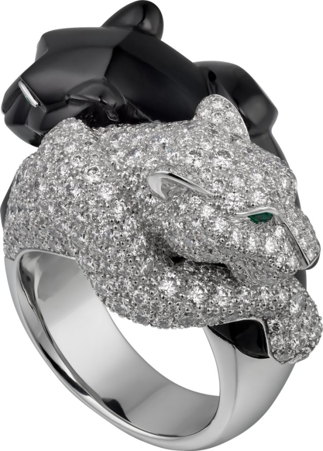 Браслет Panthère de Cartier из белого золота 18 карат с бриллиантами классической огранки, изумрудами и ониксом и два сверкающих кольца, геометрическое и другое с обнимающими кошачьими. Кольцо Panthère de Cartier 2017 года 18K белое золото, с 309 бриллиантами огранки общим весом 2,40 карата с изумрудами, ониксом и черным лаком.