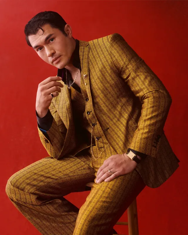Henry Golding в тематическом золотом костюме-тройке от британского дизайнера из Ганы Озвальда Боатенга, также с радостью взял редкую вещь Cartier на прокат. «Я на самом деле попросил эти часы. Я большой поклонник», — сказал он, показывая на запястье блестящие часы Cartier Tank à Guichets из 18-каратного желтого золота и черной кожи. «Это часы сна».