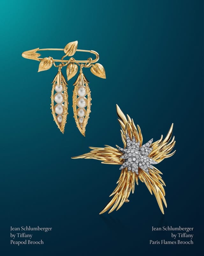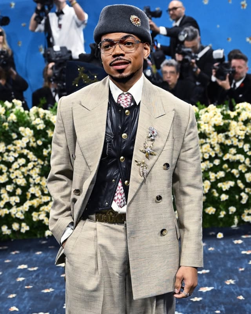 Рэпер Chance надел брошь Jean Schlumberger от Tiffany Peapod из желтого золота 18 карат с 12 культивированными жемчужинами и брошь Jean Schlumberger от Tiffany Paris Flames из золота 18 карат с бриллиантами.