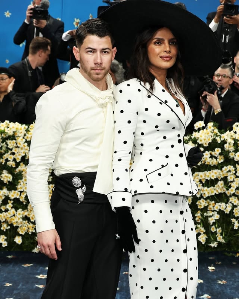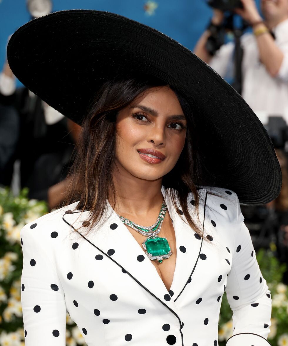 У Приянки колье шикарно смотрится на фото в черном платье. А на дорожке, с пиджаком в горошек выглядит гротескно.
