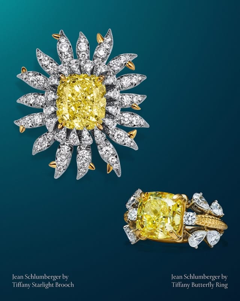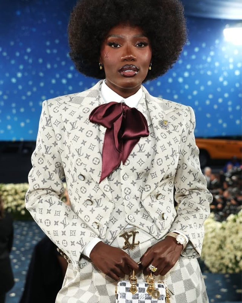 Doechii в костюме Louis Vuitton и украшениях от Tiffany & Co. Часы Tiffany Eternity из золота 18 карат с бриллиантами и перламутром, брошь Jean Schlumberger от Tiffany Starlight из платины и желтого золота 18 карат с бриллиантом Fancy Intense Yellow весом более 12 карат и акцентами из белых бриллиантов, а также кольцо Jean Schlumberger от Tiffany Butterfly с бриллиантом Fancy Intense Yellow весом более 8 карат.