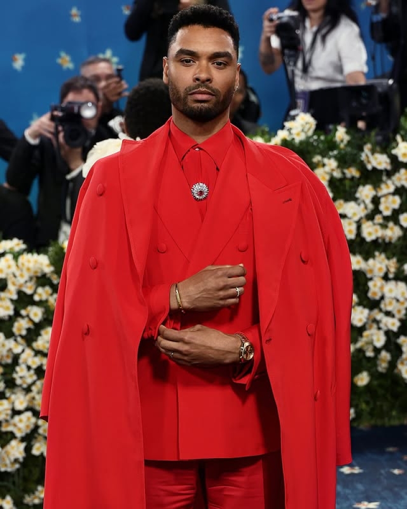 Regé-Jean Page в наряде от итальянского бренда Brioni с брошью Jean Schlumberger by Tiffany Fleurage из платины и 18-каратного желтого золота с рубеллитом весом более 3 каратов и бриллиантами.