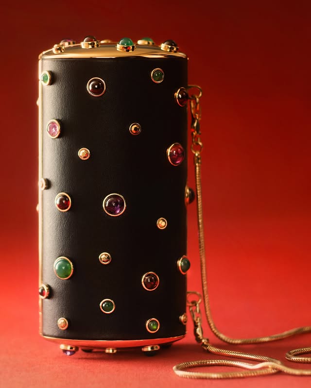 Она также носила кожаный клатч Cartier, инкрустированный аметистами, гессонитовыми гранатами и кабошонами из зеленого оникса. «Никто никогда не видел такого раньше», — сказала Дэй, когда сотрудник принес ей телефон, который был слишком велик для этого клатча.