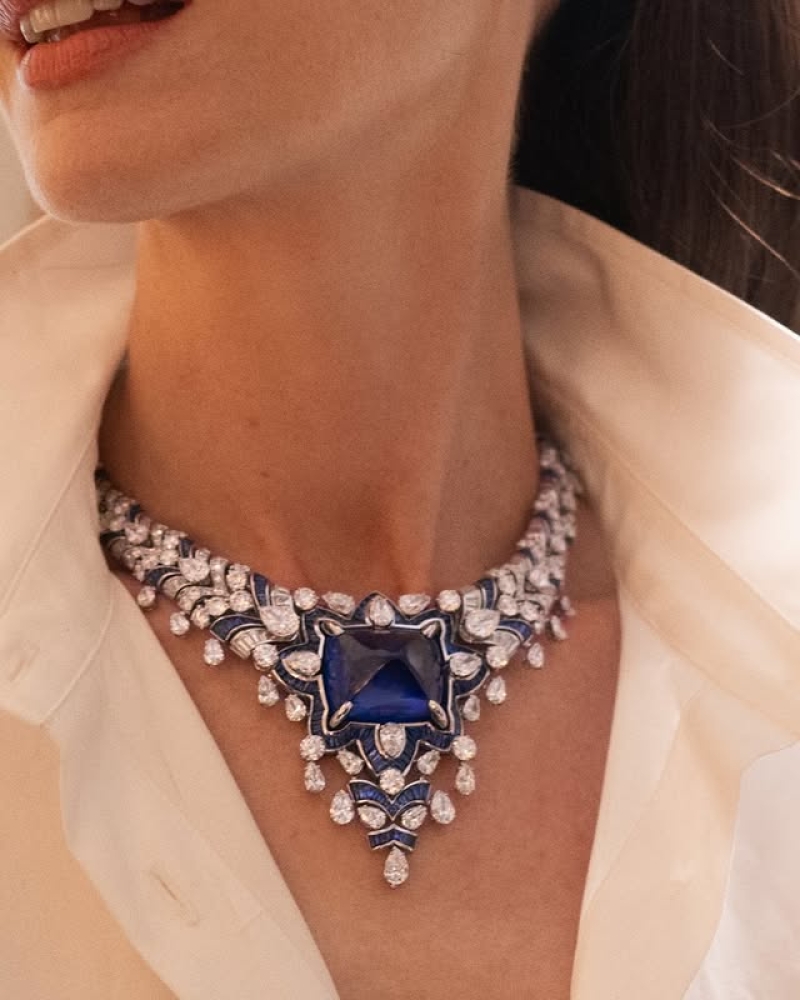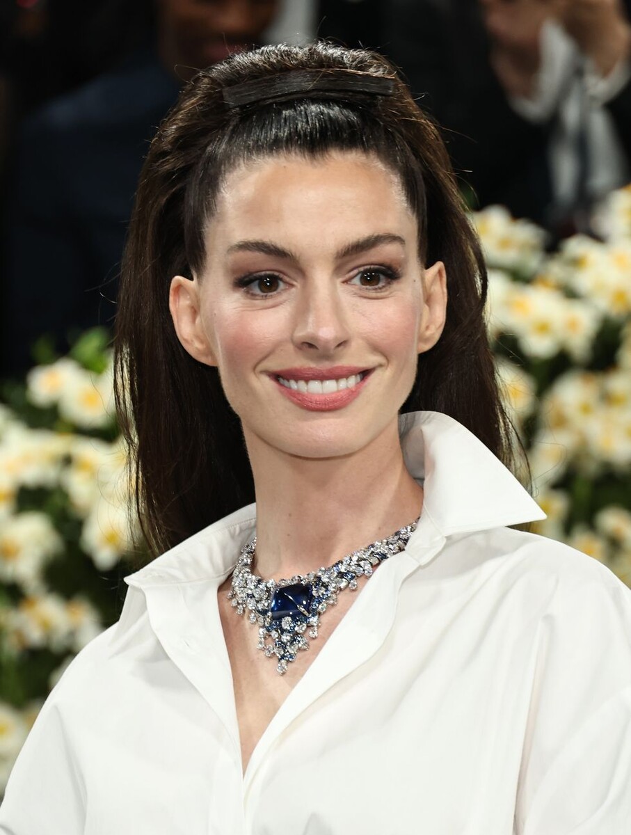 Энн Хэтэуэй в белой рубашке от Carolina Herrera и украшениях из новой коллекции Bvlgari Polychroma High Jewelry. Новая коллекция Bvlgari Polychroma High Jewelry, разработанная с великолепным мастерством Дома, была впервые показана на красной ковровой дорожке на Met Gala 2025. Ожерелье «Cosmic Vault» - это дань небесной красоте и архитектурному величию, в центре которого находится 123,35-каратный сапфир, а вокруг него - сотни сапфиров и бриллиантов. В дополнение к ожерелью она надела два одинаковых кольца этого бренда.