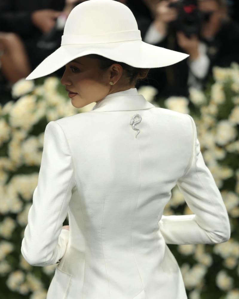 Zendaya в костюме Louis Vuitton и как глобальный посол бренда Bulgari в украшениях бренда. Серьги с желтыми бриллиантами Fancy Vivid Yellow, бриллиантовое кольцо  и бриллиантовая брошь-змея Blugari Serpenti, приколотая к спине ее костюма.