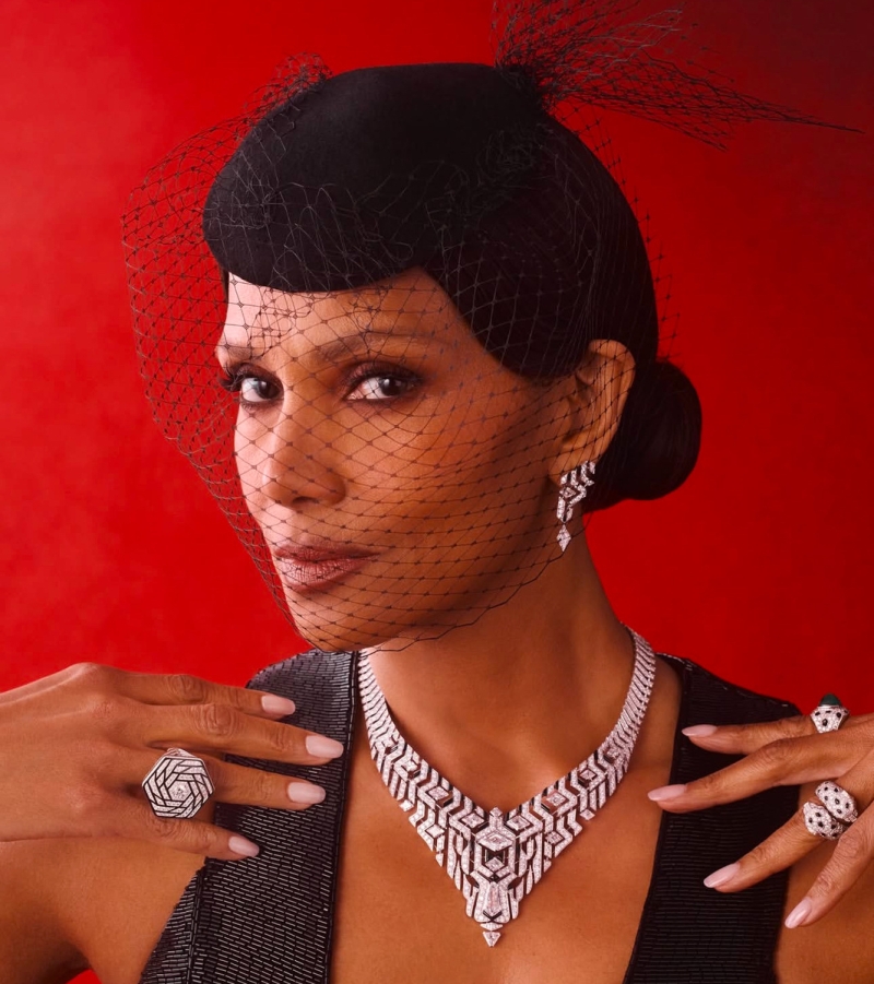 Холли Берри продемонстрировала новый комплект украшений из коллекции En Equilibre от Cartier. Ожерелье Tsagaan, выполненное из белого золота 18 карат, оникса и бриллиантов, было вдохновлено монгольским снежным барсом и создано с использованием бриллианта весом 3,51 карата. Его минималистичный дизайн построен на игре линий, создающей оптическую иллюзию: голова хищника то появляется, то исчезает в зависимости от угла зрения. Название Tsagaan происходит от монгольского слова «снежный», отсылая к снежному барсу — одному из самых скрытных представителей семейства пантер. Cartier удалось передать его грациозную неуловимость в этом уникальном ювелирном образе. На изготовление ожерелья ушло более 1000 часов. Она сочетала его с подходящими серьгами, на изготовление которых также ушло более 300 часов. В комплект вошло также кольцо из коллекции Panthère de Cartier. «Когда мы с Линдси [Флорес, моим стилистом] рассматривали варианты для сегодняшнего вечера, мы почувствовали, что чистые геометрические линии и резкий контраст оникса с белым золотом и бриллиантами действительно подходят для этой темы», — сказал Берри. «Именно внимание к мельчайшим деталям — понимание того, как мы можем привнести элементы строгого кроя в каждый аспект образа — делает Met Gala таким захватывающим событием, частью которого стоит стать», — добавила она.