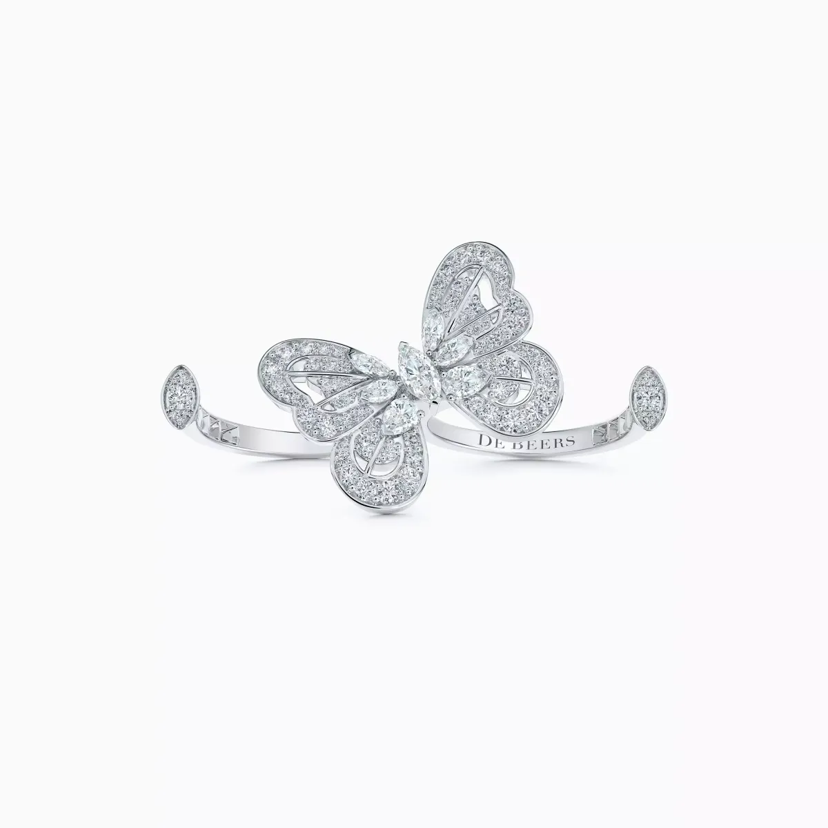 Кольцо с бабочкой «Портреты природы» из белого золота. Современная элегантность и свободолюбивость коллекции запечатлены в этом изящном двойном открытом кольце. Бабочка выглядит так, будто просто сидит на руке. Тело бабочки украшено белыми бриллиантами в форме микропаве, общей весом ~1,67 карата. Установленный на 18-каратном белом золотом поясе, изящный ажурный дизайн позволяет естественному свету проникать через крылья, создавая исключительный блеск с любого ракурса. Первоначальная цена $19,100.