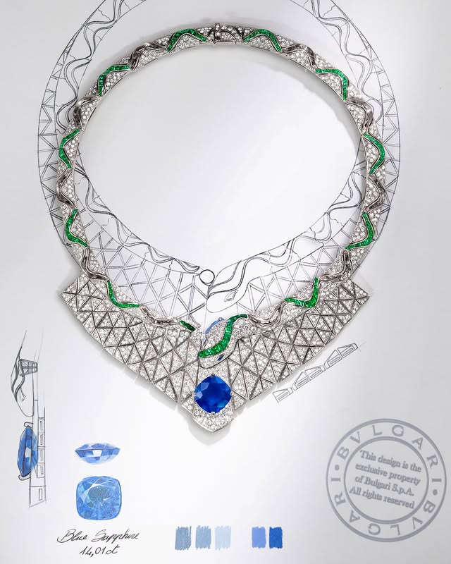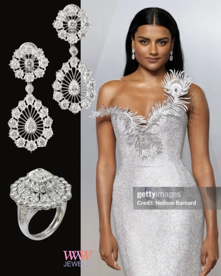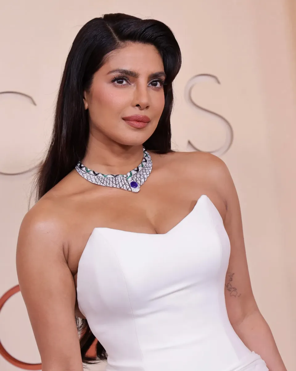 Priyanka Chopra Jonas в белом платье Dior, украшенное шёлком без бретелек, вышитое перьевым боа, что добавляло движения и мягкость силуэту. Тем не менее, центральным украшением было несомненно ожерелье «Serpenti Illusio» из коллекции Bvlgari Eclettica High Jewelry, украшенное антикварным сапфиром с подушечной огранкой 14,01 карата с Мадагаскара, окружённое бриллиантами, изумрудами и ониксом. Построенная из 235 элементов за более чем 1300 часов, эта работа тонко формирует змеиный мотив — фирменный элемент дизайнерского языка Bvlgari. Образ актриса завершила бриллиантовыми серьгами и украшенным кольцом, сосредоточив внимание на великолепном ожерелье.