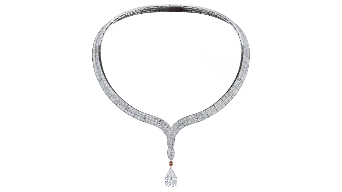 Ожерелье "Нежность" с потрясающим бриллиантом в форме груши весом 7,02 карата из коллекции Natural Works of Art компании De Beers. Бриллиант подвешен на этом исключительно элегантном ожерелье, вдохновлённом переплетением слоновьих хоботов.