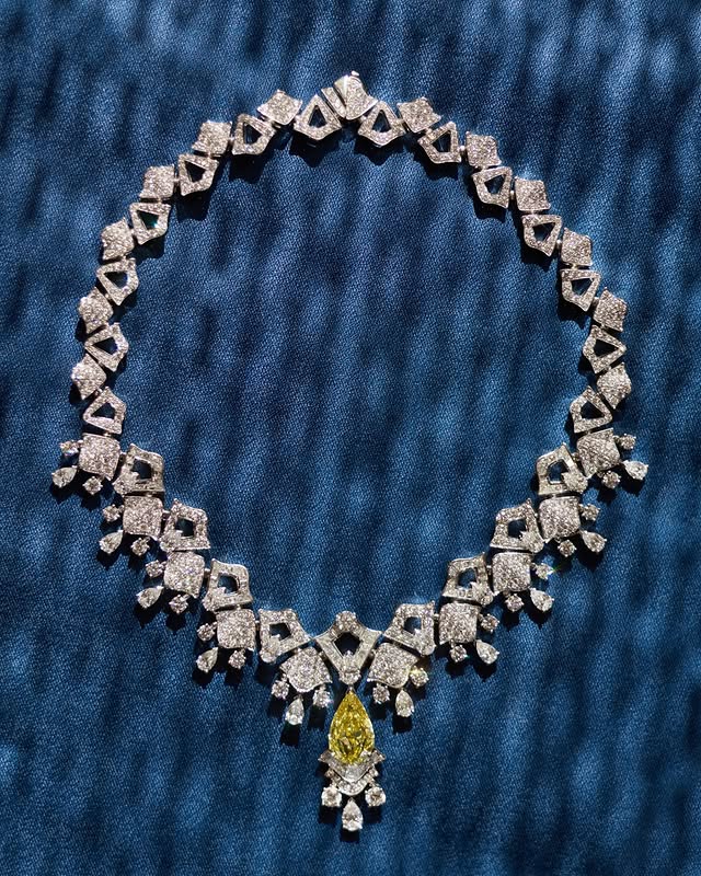Главной звездой её ансамбля стало ожерелье из 18-каратного жёлтого золота с красивым светло-жёлтым бриллиантовым кулоном объемом 30,29 карата.