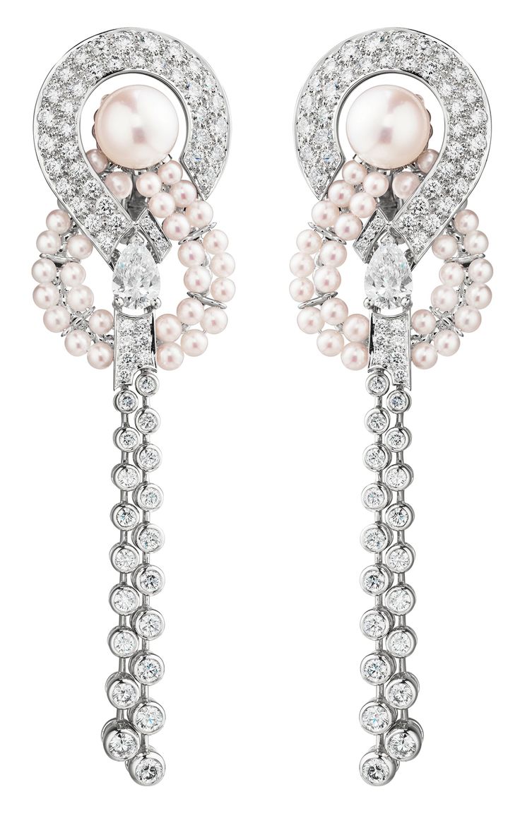Серьги Endless knot "Бесконечный узел" из коллекции FlyingCloud Chanel 2017 из белого золота 18 карат с 2 бриллиантами жемчужной огранки (1,44 карата), 62 японскими культивированными жемчужинами и 132 бриллиантами бриллиантовой огранки.