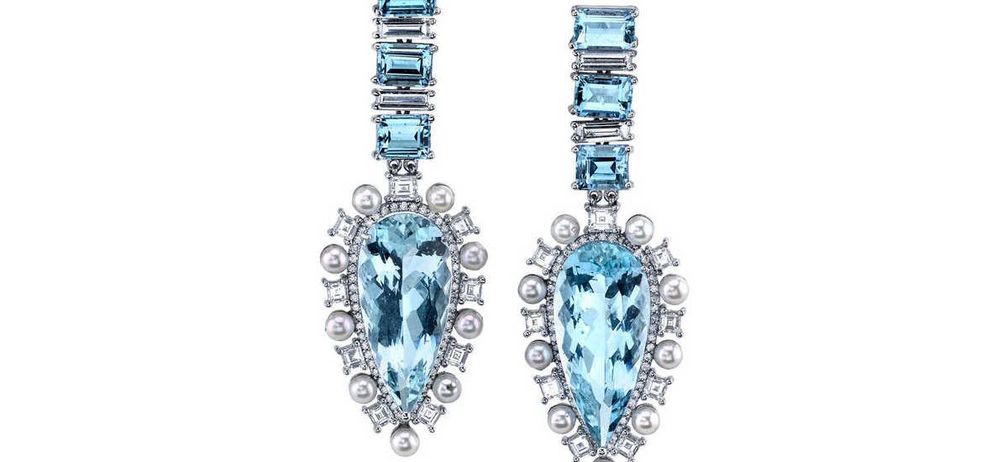 Sara Sampaio в платье Georges Hobeika и серьгах с кольцом из белого золота 18 карат, украшенных аквамарином, бриллиантами и жемчугом.