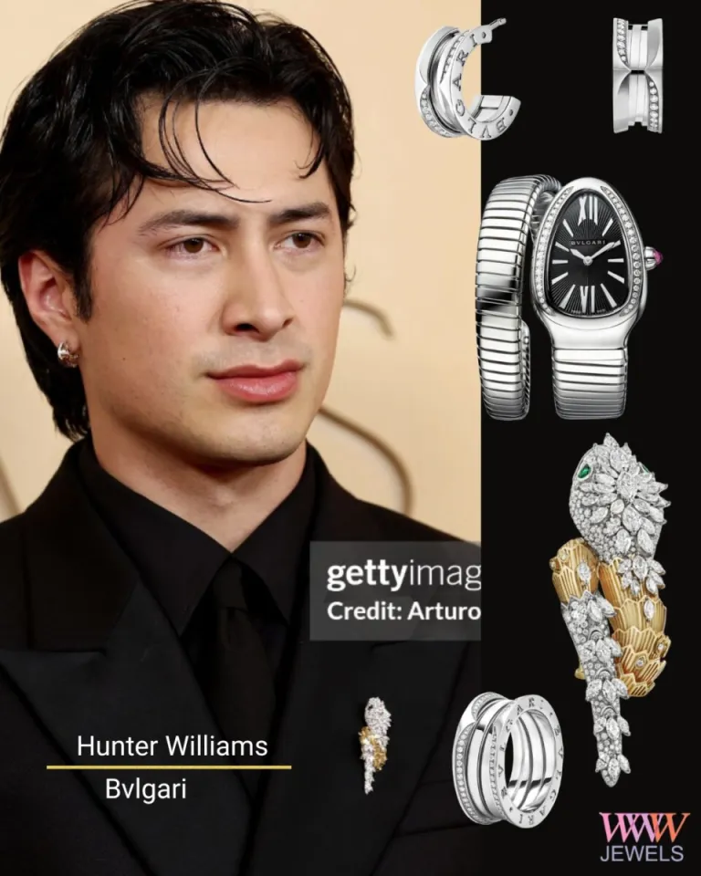 Hudson Williams с классической брошью Serpenti, которая демонстрировала два грушевых изумруда и 52 маркизных бриллианта, украшенных паве. Вместе с часами Serpenti Tubogas Seduttori Ref. 103145 из 18-каратного розового золота, с белыми золотыми серьгами-кольцами и двумя массивными кольцами количество каратов чуть превышало 70 карат.