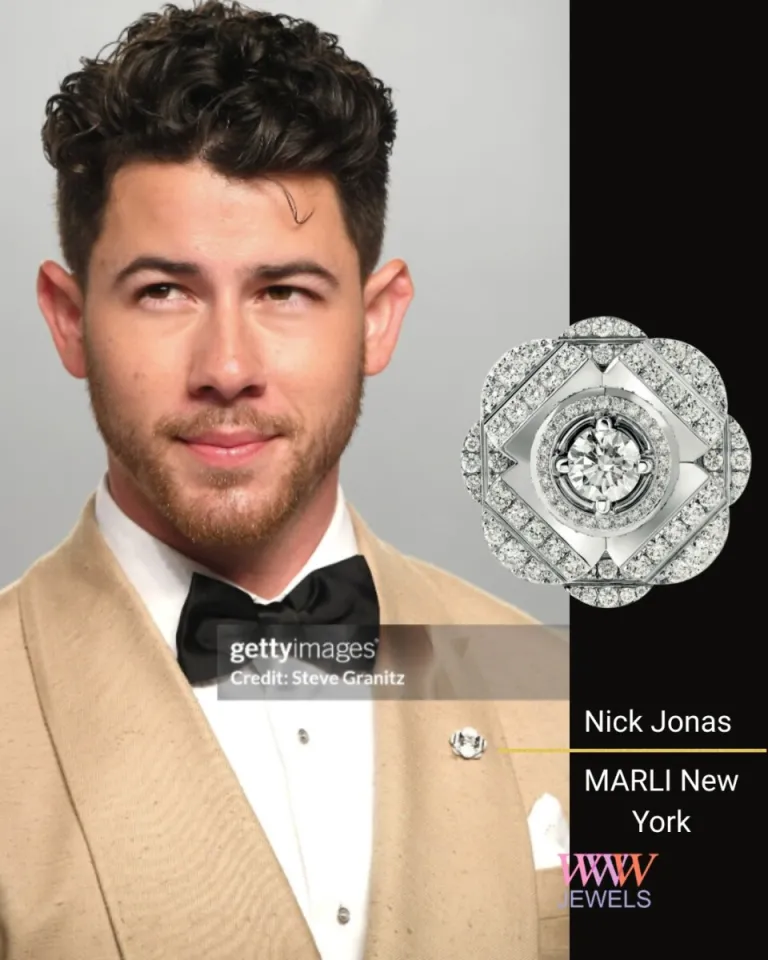На гала-ужине Nick Jonas и его стилист умело превратили одну 18-каратную бриллиантовую серьгу-гвоздик Darli из коллекции Marli New York High Style в брошь. Кто бы мог подумать, что одна серьга справится с таким блестящим делом?