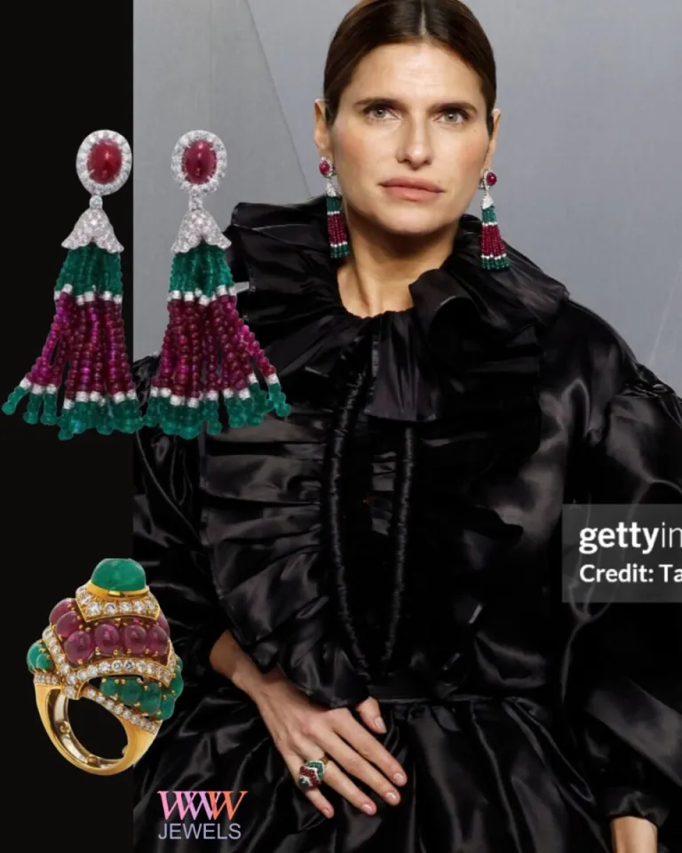 Lake Bell в платье Harbison Studio и серьгах с кисточкой пагоды с бриллиантами, изумрудными и рубиновыми бусинами, а также коктейльным кольцом из рубинов кабошона, изумрудов и бриллиантов.