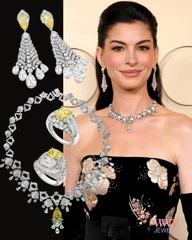 Anne Hathaway в кутюрном платье Valentino SS26 и украшениях из коллекции high jewelry — Eclettica. Ожерелье Starlight High Jewelry из коллекции Bvlgari Eclettica High Jewelry с грушевидным бриллиантом бриллианта Fancy Vivid Yellow ярко-желтого цвета весом 8.02 карата, вставленный в съемную подвеску, усиленном светящейся композицией из более чем 35 каратными бриллиантами, которые захватывают и отражают свет с скульптурной точностью. Колье актрисы напоминало гряду маленьких облаков с искрящимися капельками дождя. Серьги Daphne's Laurel (вдохновлёнными греческим мифом об Аполлоне и Дафне) и два платиновых кольца. Всего на создание колье, серег и колец ушло более 850 часов.
