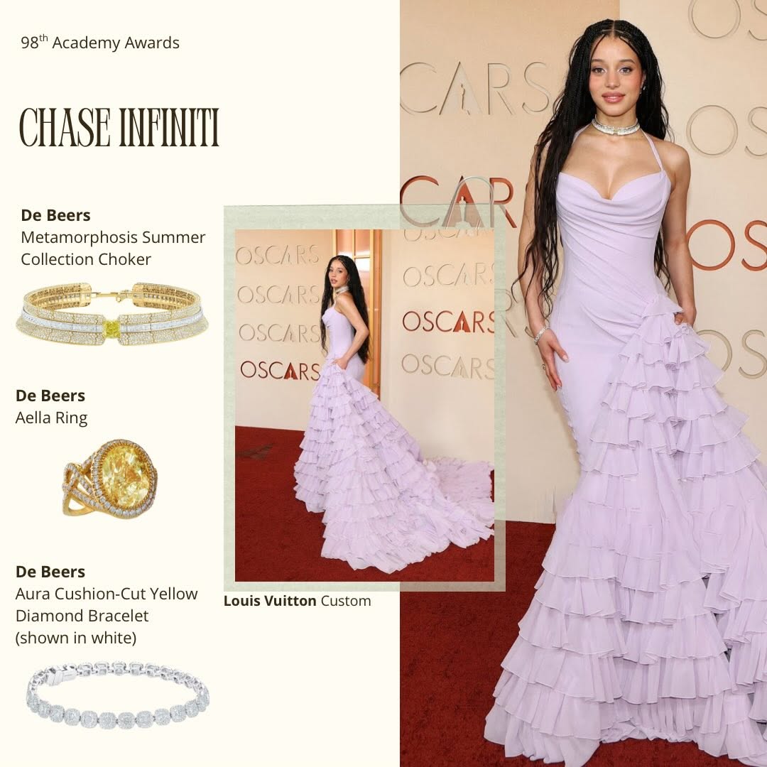 Chase Infiniti в светло-лавандовом платье Louis Vuitton, сшитом на заказ, и украшениях De Beers поразила разнообразием блеска, включая центральную вещь - бриллиантовое ожерелье «Summer» из коллекции De Beers London Metamorphosis 2023 Couture Collection. Серьги-гвоздики с бриллиантами в форме груши, браслет с бриллиантовой линией и два комплекта колец — оба из жёлтого золота.