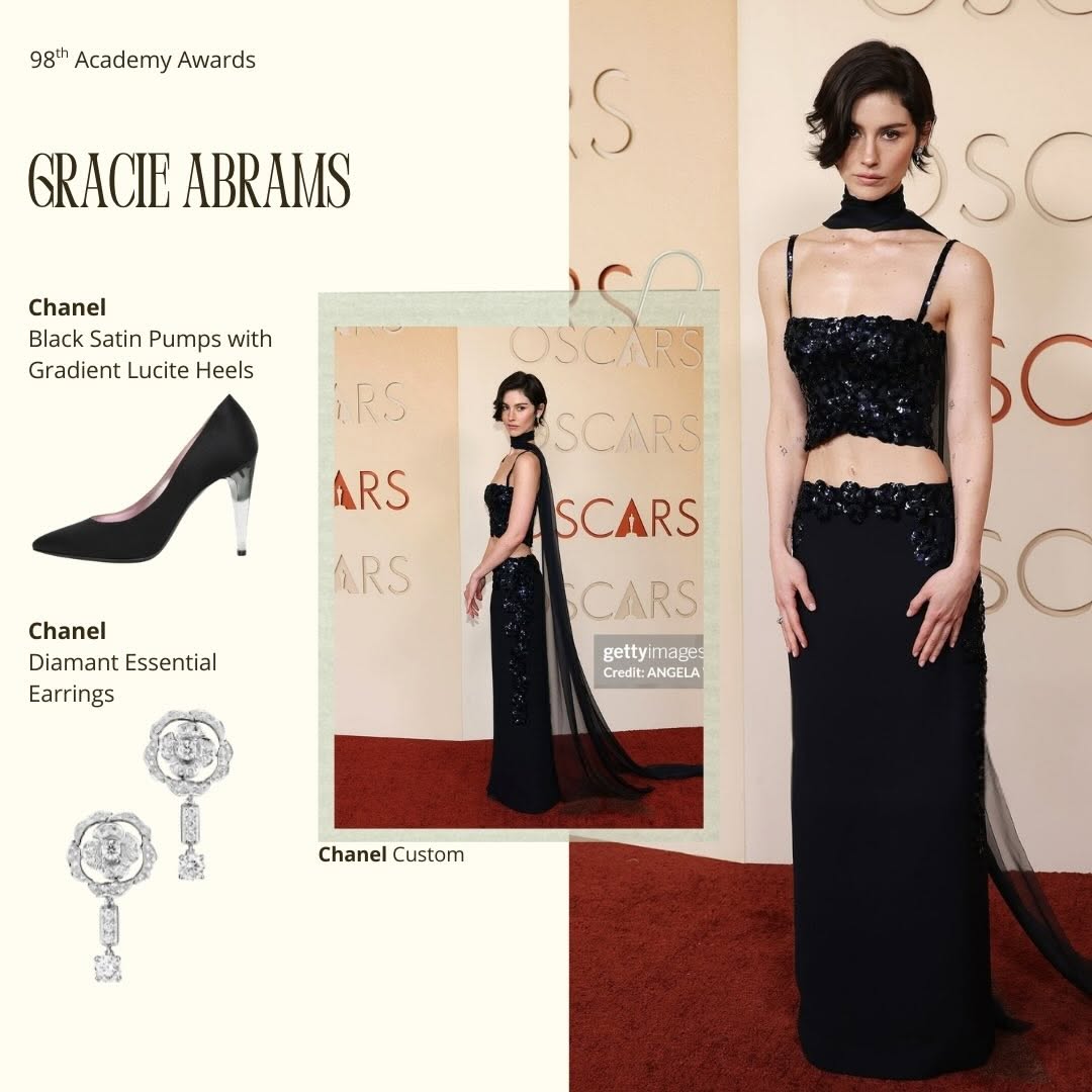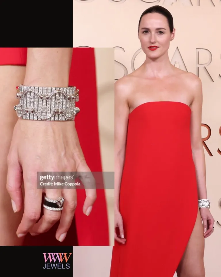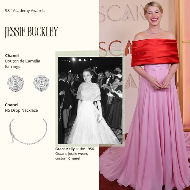 На победительнице в категории «Лучшая женская роль» Jessie Buckley были индивидуальное платье Chanel, простое ожерелье No5 из 18-каратного белого золота, кольцо Jeanne из коллекции Coco Avant Chanel и скромные пуссеты в форме цветов камелии Bouton De Camélia. Ансамбль, достойный для лучшей женской роли.