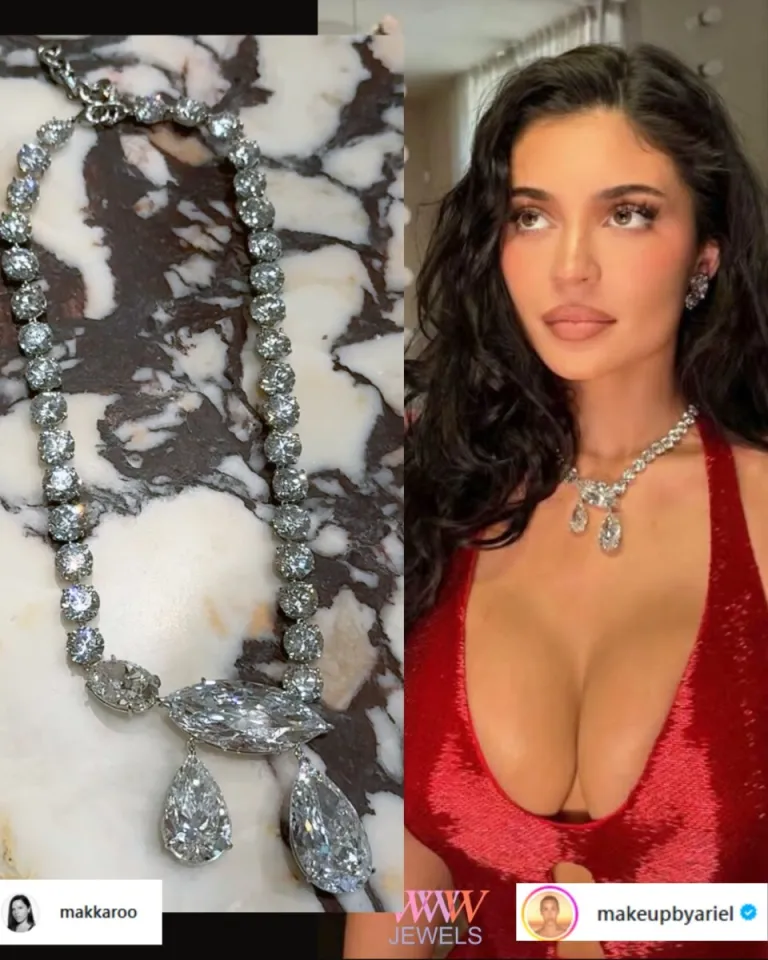 Kylie Jenner в красном платье Schiaparelli, хоть и не выходила на ковровую дорожу, все равно все заметили её драгоценности. Особенно примечательно асимметричное бриллиантовое ожерелье Lorraine Schwartz с двумя грушевыми каплями, свисающими на гигантской маркизе, еще бриллианты в сережках и её фирменном кольце на мизинце, и всего получилось 200 карат.