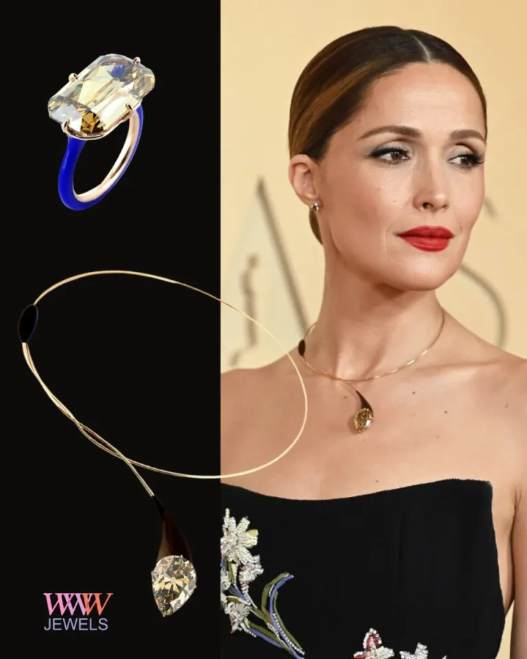 Rose Byrne в платье Dior и самом заметном украшении на красной дорожке — уникальном ожерелье нью-йоркского ювелирного дома Taffin, основанного James De Givenchy (племянник того самого Юбера Живанши) и известного своим нестандартным использованием материалов и смелыми скульптурными дизайнами. Роуз Бирн показала: красоту украшений определяет не количество камней, не их чистота или характеристики, а зачастую именно дизайн — линии и форма. Колье инкрустировано 22-каратным бриллиантом огранки «груша» цвета fancy yellow brown. Кстати, в обозначениях цвета камней последняя характеристика (brown) — основная, а та, что стоит перед ней (yellow), указывает на присутствующий оттенок. Роуз дополнила образ кольцом Arizona Blue той же марки — таким же лаконичным и при этом впечатляющим. В нем 16,54 карата бриллианта цвета yellow brown, он также происходит из Ботсваны в огранке ashoka. Огранка «Ашока» — патентованная техника, созданная Уильямом Голдбергом в 1999 году. Благодаря исключительному блеску и игре света камни в этой огранке визуально кажутся на 30–50% крупнее, чем камни изумрудной огранки того же веса.