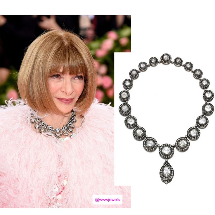 Anna Wintour в Dior и архивном бриллиантовом колье Oscar Massin XIX века из личной шкатулки, укрепив свою репутацию сочетания кутюрной моды с архивными украшениями.