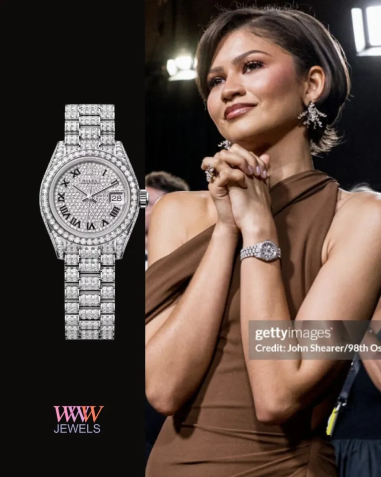 Zendaya в шоколадно-коричневом платье Louis Vuitton от Nicolas Ghesquière, с часами Rolex Lady Datejust полностью покрытыми бриллиантами, и больше похожими на браслет, чем на часы.
