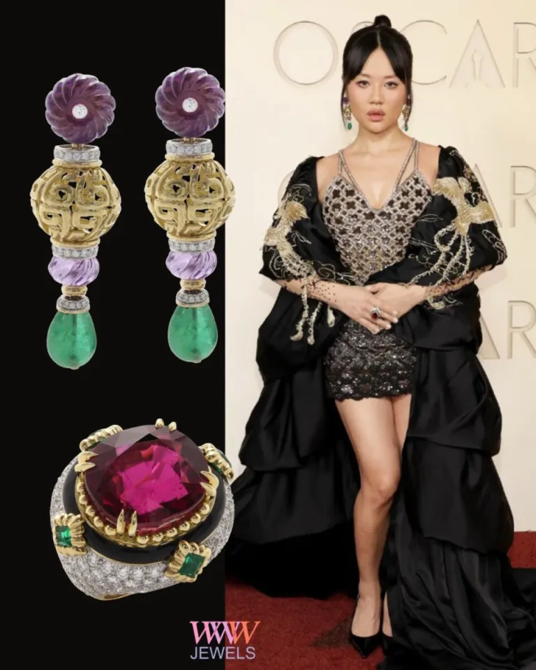 Rei Ami в платье Rahul Mishra и серьгах Sky Lantern от David Webb с изумрудными каплями, аметистовыми бусинами и бриллиантами с блестящей огранкой, а также коктейльный набор из изумрудов, бриллиантов и рубеллита (это разновидность турмалина с характерным розовым оттенком, который придают примесью марганца).
