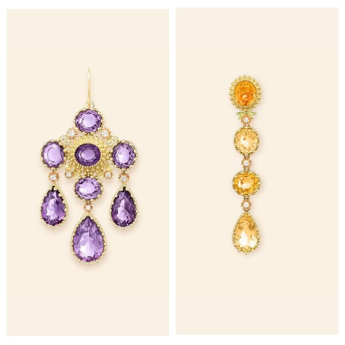 Асимметричные серёжки с цитрином на одной и аметистом с алмазом — на другой.