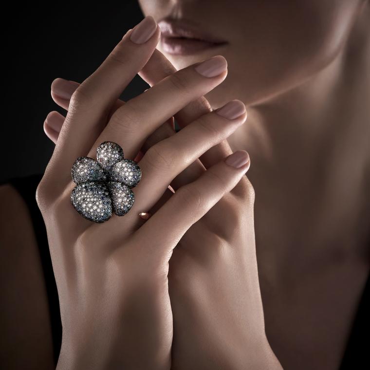 Переход от дня к ночи красноречиво выражен в этом зрелищном кольце. Градуированная палитра сине-серых шпинелей, сапфиров и бриллиантов на этом двойном кольце отражает тона света. Как и все драгоценности Pomellato, кольцо Flower Power изготовлено вручную в мастерских фирмы в Милане и полностью изготовлено из золота и бриллиантов, полученных из сертифицированных источников Responsible Jewellery Council.
